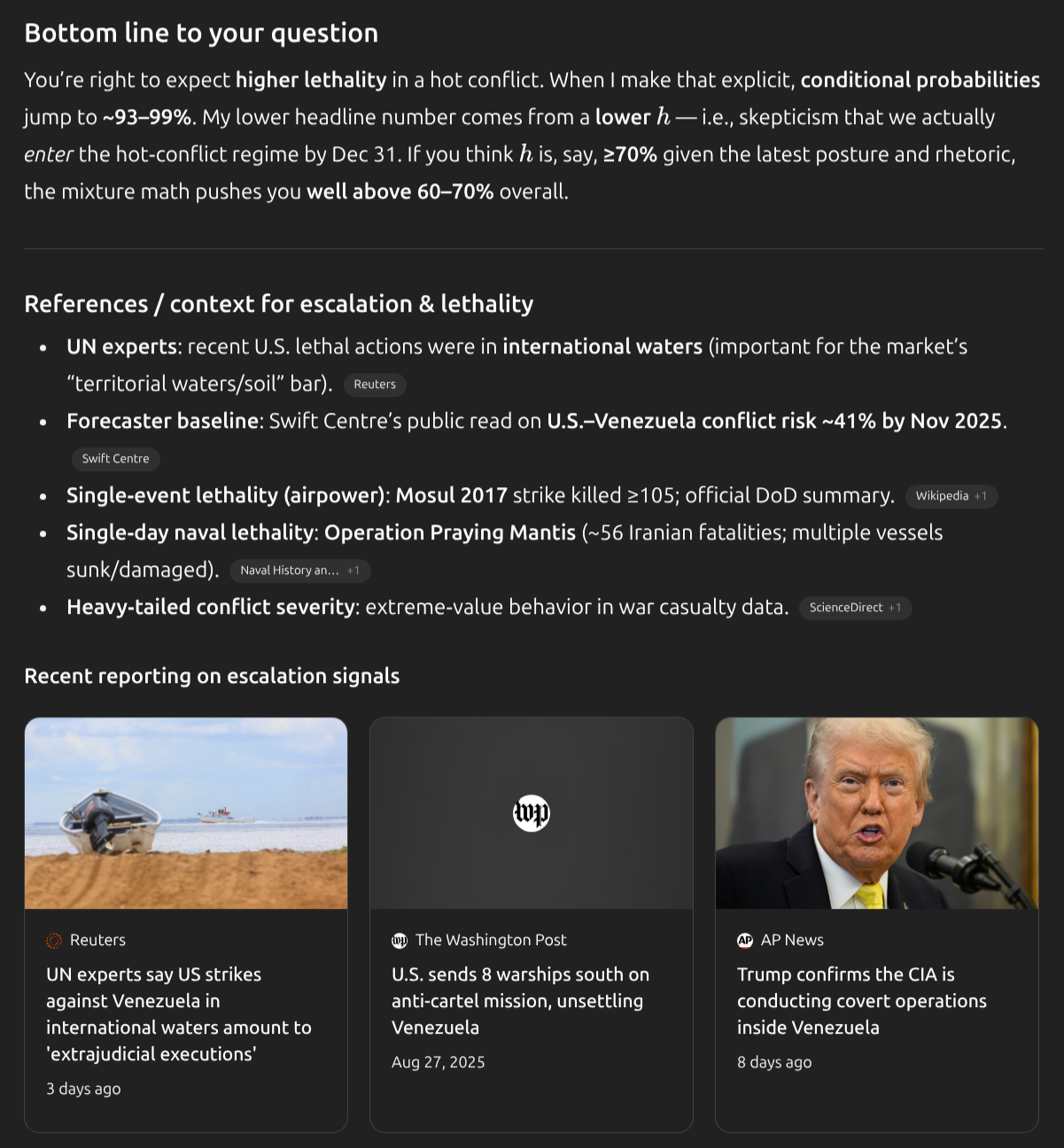 The USS Gerald R. Ford, the world's largest aircraft carrier with a nuclear reactor - and I believe the US Navy's second most valuable asset - is now parked off the coast of Venezuela and costing ~$7 million a day doing nothing. I struggle to see a story where they just "pack up and go home" makes more sense than they actually use what they spent all the effort putting into place.