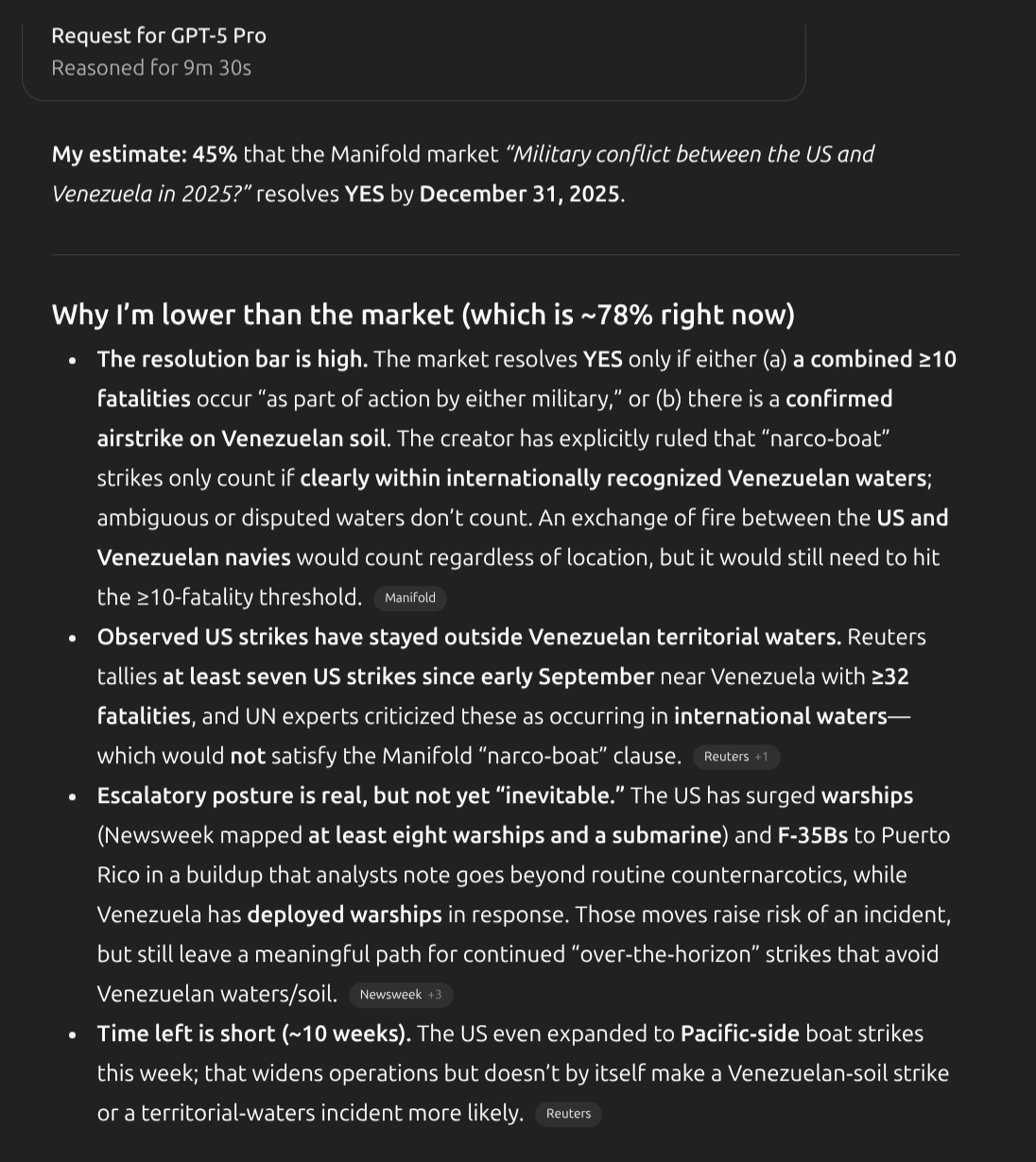 @Dulaman I had no idea chatgpt was that "intelligent", kinda scary. I wonder how well an entirely AI run manifold account would end up doing, maybe a series of them with different ais. Could bet on which does best.