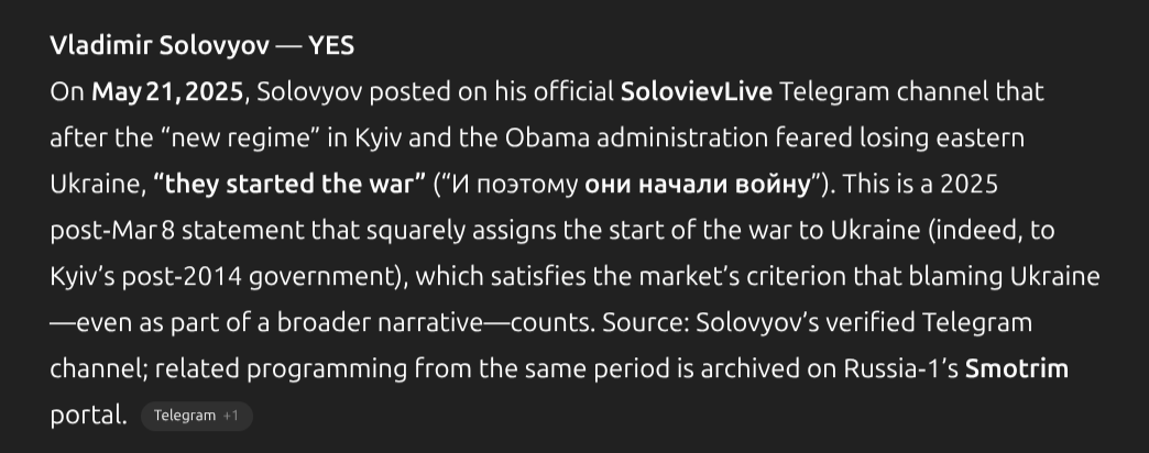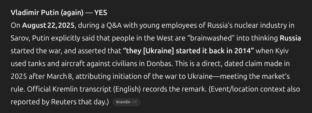 This market will resolve YES for any individual listed who makes a public statement in 2025 falsely claiming that Ukraine initiated or is responsible for starting the war with Russia.